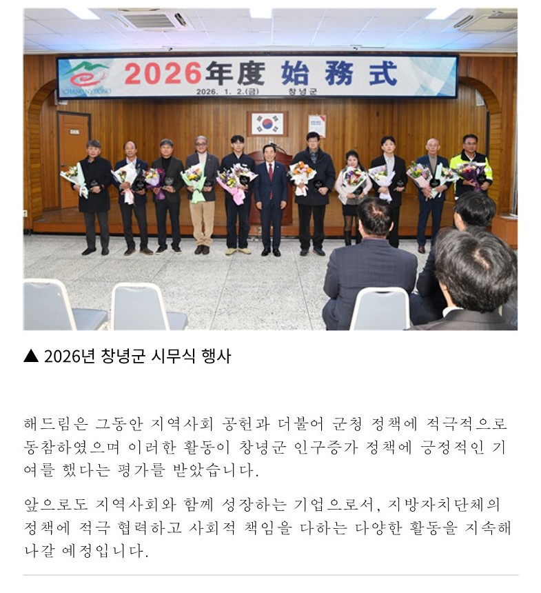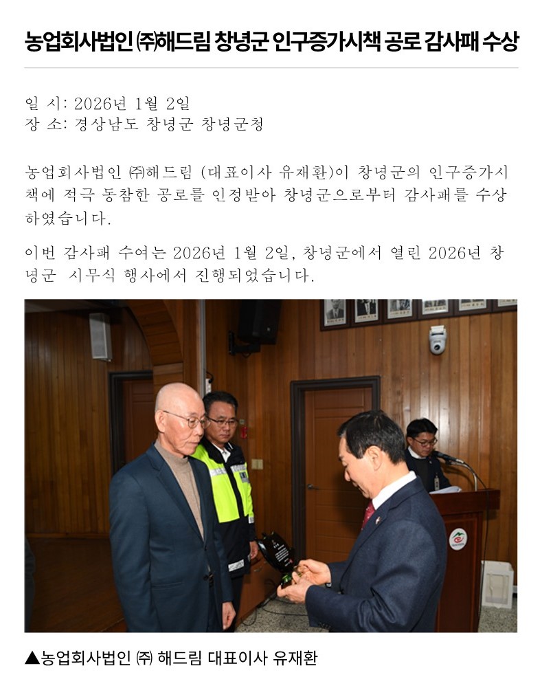 농업회사법인 ㈜해드림 창녕군 인구증가시책 공로 감사패 수상